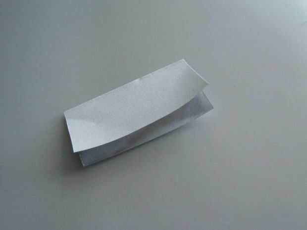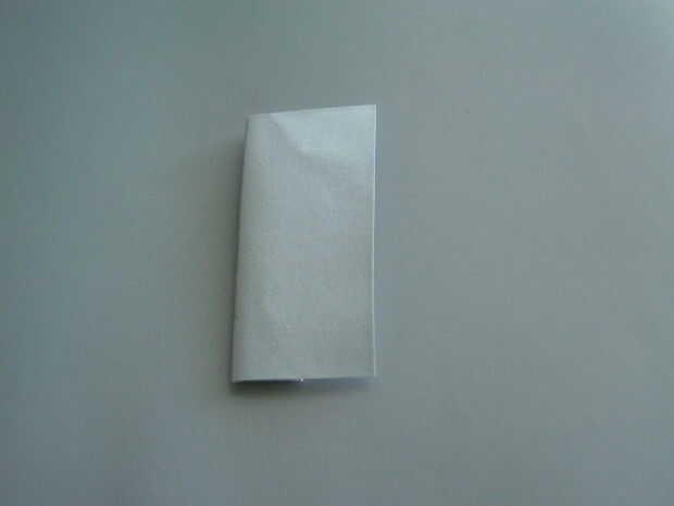 Doble el papel en medio, lateral del plata. Ahora doble la aleta hasta el pliegue medio y repetir del otro lado.