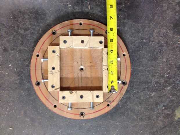 Cortar un círculo de madera contrachapada, 10" de diámetro, con un orificio de 1/4" en el centro muerto. Aproximadamente 1" desde el borde del círculo, hacer cinco 1/4" agujeros espaciados uniformemente sobre la circunferencia. Para aquellos que por temor a profundizar demasiado en los secretos de las matemáticas, cada agujero está separada por un arco de 72 grados. Siguiendo a lo largo de la imagen, esta es la línea roja y los cinco hoyos no marcados a lo largo de su camino. Los orificios marcados son adicionales, para risas. No tienes que hacerlos.