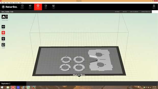 Descargar todos los archivos .stl adjunto. Usted tendrá que imprimir dos veces lens_holder_holes y lens_holder_peg. Puede configurar su máquina de cortar todas las piezas como he mostrado, o imprimirlas por separado.