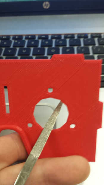 Cuando hayas llegado a este paso, debe tener dos juegos de los sostenedores de la lente y una versión de la carátula a imprimir. En este punto, prueba ajustar sus lentes en la cara frontal. Probablemente no encajan. No te asustes. Los orificios de la placa no son círculos exactos debido a la forma que se crean ficheros .stl. Además, yo Ieft ellos un poquito más pequeños para compensar las tolerancias diferentes de las impresoras. Utilice una escofina, lija, archivo etc. para suavizar los orificios hasta que las lentes encaja perfectamente.