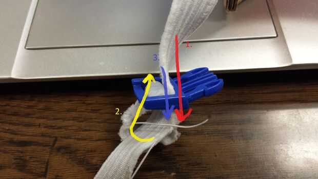 La segunda parte es un poco más complicada. Nuestra correa tenía un coeficiente de fricción demasiado baja para sostener con seguridad en el lugar a través del método normal de la correa de fijación. Si examina la imagen de ejemplo, rosca la correa a través de la primera ranura 1., alrededor del segundo 2., luego en los 3 primeros. Esto hace que la correa bloquear con sí mismo. Se tensará sin problema, pero aflojarlo será un poco más difícil.