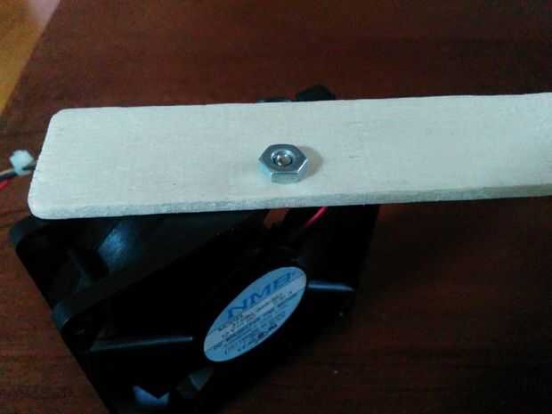 Ponga el perno a través del ventilador, luego a través del palillo y aplique la lavadora. Apretarlo para que no se mueve fácilmente, pero suficientemente por lo que todavía puede ajustar el ventilador hacia atrás y adelante para el posicionamiento.
