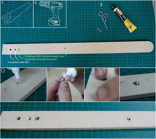 Primero tienes que vio un trozo de madera. Luego tienes que recrear los mismos orificios como en la papelera.
