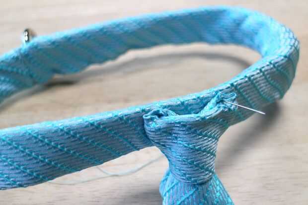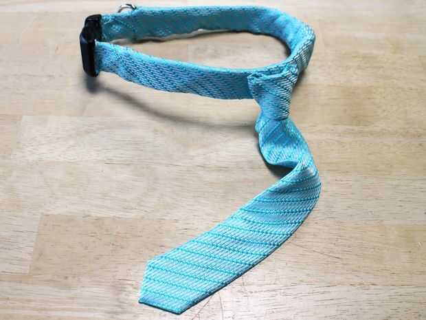 Los elementos principales de la corbata perro ahora completados, todo lo que queda si hacer es fijar el lazo para el cuello envuelto. Localicé el nudo de la corbata frente a la pinza de la correa, que forma el lazo siempre colgará hacia abajo si la correa se une.