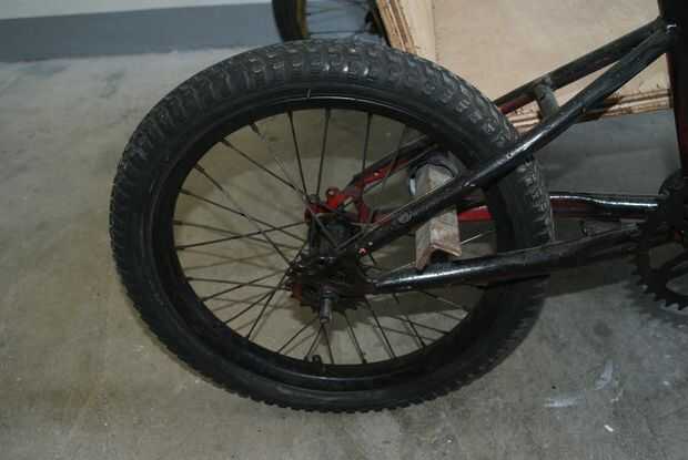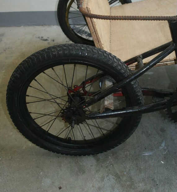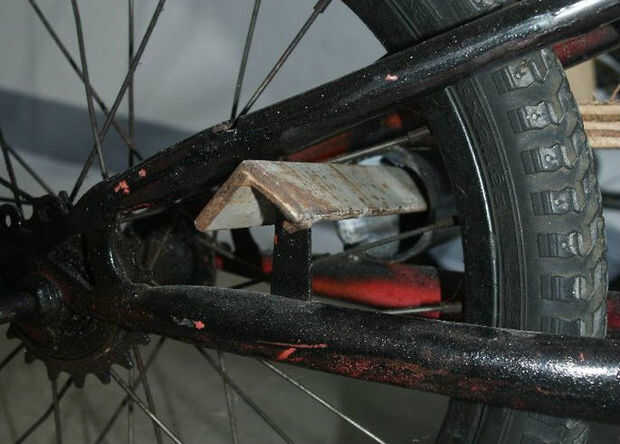 Para hacer la parte trasera del vagón, tomar el 46'' pedazo de varilla y curva 90 grados en 9'' de cada extremo y soldarlo en la parte superior del tubo del asiento en cada moto (una de mis bicicletas tenía un tubo de asiento corto, así que tuve que ampliar un extremo de la varilla 5'' por lo que podría alcanzar con el tubo superior).