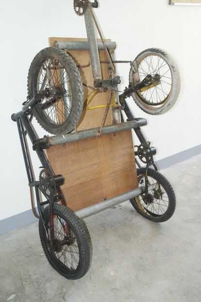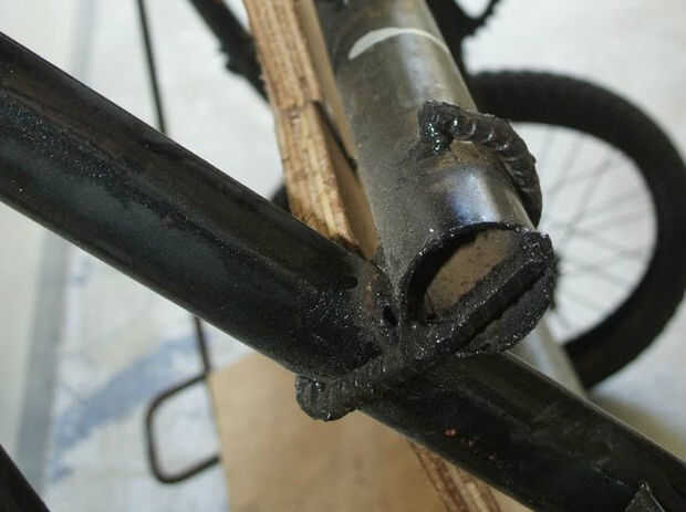 Soldar un extremo de cada uno de los dos pedazos de 21'' refuerzo a cada una de las esquinas libres de la parte del rectángulo de la parte inferior del marco y el otro extremo a cada uno de los tubos superiores respectivos de las bicicletas. Esto es para apoyar la parte delantera de la parte inferior del marco. (Ver fotos 5 y 6).