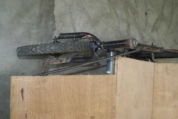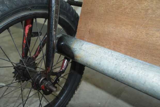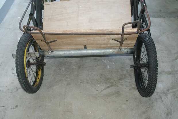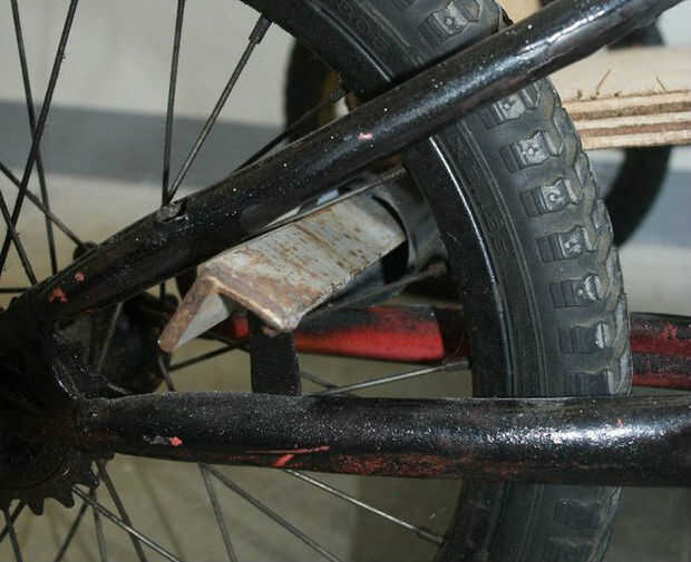 Fotos 9, 10, 11 y 12 muestran el sencillo freno de mano: un trozo de barra de ángulo insertada en el tubo a través de la rueda trasera.