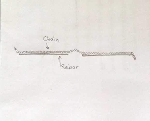 En el interior de las horquillas de las bicicletas de marco, soldar los dos trozos de barra de ángulo, apuntando hacia delante horizontalmente y paralelo a la rueda. Esto debe ser en el mismo nivel que el "mango" de la horquilla de tracción (imagino que está tirando en los dientes). Soldar los dos 8 3/4 '' trozos de varilla paralela a la cadena de la bicicleta ha guardado, así que hay un poco de cadenas libres en los extremos y en el centro. Esto es para hacer la cadena rígida a lo largo de 8 3/4 '' en ambos extremos. (Vea el dibujo segundo.) Fijar los extremos de la cadena a los extremos de las barras de ángulo, dejando sólo un eslabón que puede convertir entre la parte rígida y la barra de ángulo. La parte media de la cadena libre a la "manija" de la horquilla de tracción, también dejando sólo un enlace libre girar en ambos lados de la soldadura. Los enlaces gratis solo funcionan como bisagras, que es la única razón para la cadena. (Ver fotos 5 y 6).