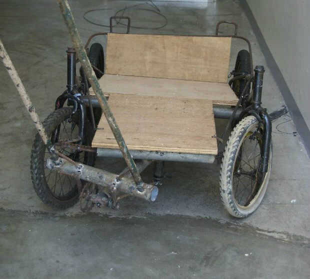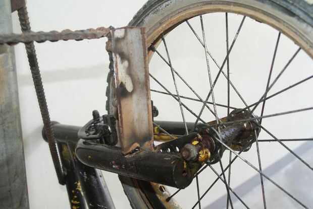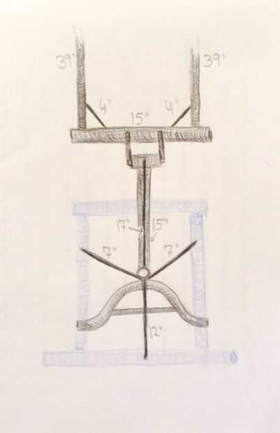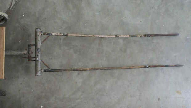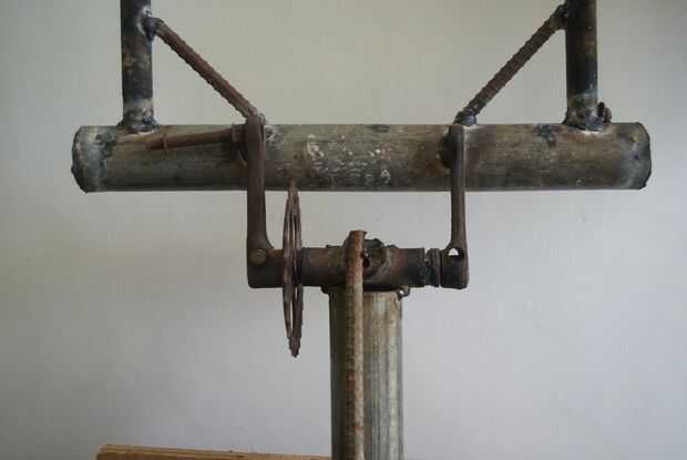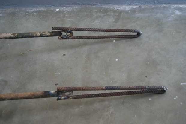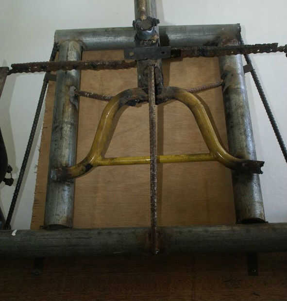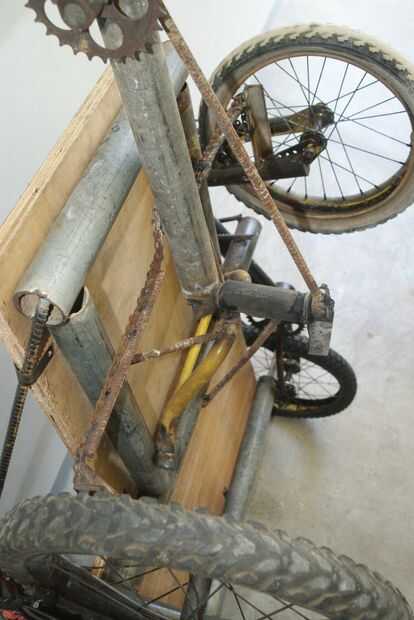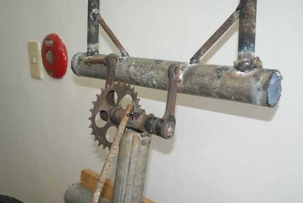 Soldar la caja del pedalier de la bicicleta tercer horizontalmente en el extremo libre de 15'' pedazo de tubo de acero. Vuelta una de las bielas, por lo que señalan en la misma dirección. En las bielas, soldar otro trozo de 15'' (2'' diam.) tubo de acero en ángulo recto a la primera tubería de acero. En los extremos de la tubería de este último, también en ángulo recto, soldar con autógena los dos 39'' pedazos de 7/8 '' de acero de la pipa para que sean paralelas. Utilice los dos 4'' trozos de varilla para reforzar los ángulos. (Ver fotos 9 y 10). Esto hace que un tenedor gigante de dos clavijas. Aplanar los extremos de las dos clavijas verticalmente y taladre dos orificios para el paso final. Para ampliar las dos "clavijas", doblar los dos 29'' pedazos de 1/2 '' acero de refuerzo en forma de U y soldar en los extremos de las clavijas. (Ver fotos 11 y 12).