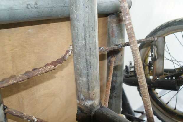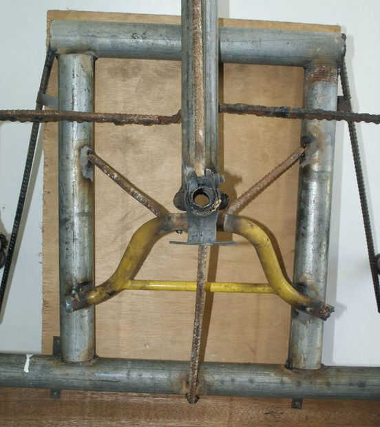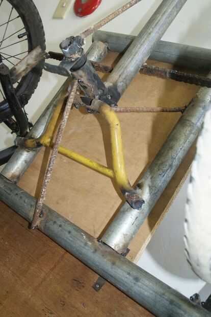 Apoyo, soldar un extremo de la 17'' pedazo de varilla hasta el final de manillar de la horquilla, atravesando el tubo superior (en el centro de la pirámide). Soldar el otro extremo al final de los 15'' pedazo de tubo de acero Unido antes. Soldar un 12'' pedazo de varilla hasta el final de manillar de tubo superior yendo hacia atrás hasta el extremo posterior del rectángulo del marco.