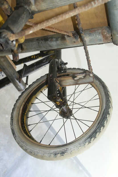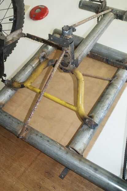 La configuración de dirección forma algo que parece una pirámide cuadrada boca abajo en el rectángulo del marco. La configuración de dirección se basa en uno de los manillares de las bicicletas, que forma la parte posterior de la pirámide. En el centro de la pirámide es el tubo superior de la tercera bici, al final de la horquilla que es soldado con autógena en el manillar (esto hace que una aguja en la cima de la pirámide). Este tubo superior debe estar en consonancia con los cubos de las ruedas delanteras. Los dos 7'' pedazos de varilla forman las otras dos esquinas de la pirámide para la ayuda.