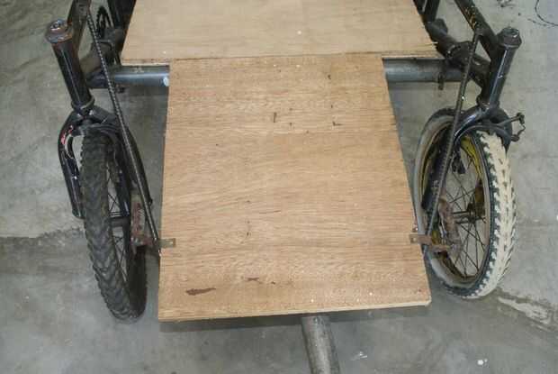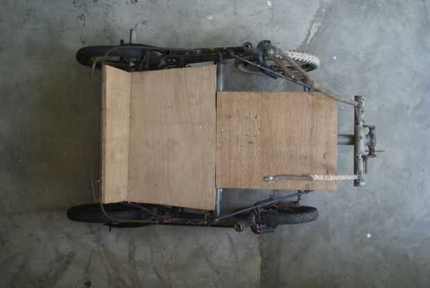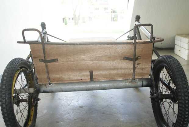 Los 25'' x 17'' pedazo de madera contrachapada y una 25'' parte 1'' más corta en cada extremo, que un trapecio (ver dibujo). Conecte el lado de 17'' del 20'' x 17'' pedazo de madera contrachapada a la mitad del lado 25'' de la pieza más grande con dos tiras de metal y tornillos. Este es el fondo del vagón. La última pieza de madera contrachapada es la parte de atrás. Conéctela a la parte inferior con una tira de metal en el medio. Para colocar todo esto en el marco de la carreta, utilice dos tiras de metal a través de los soportes de J en la espalda y uno en cada extremo de los soportes para el frente.