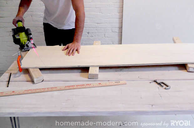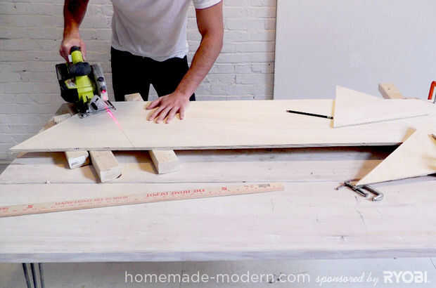 Una vez que se han marcado los triángulos, utilice la guía de láser en la Sierra de circular RYOBI para seguir las líneas y cortar los triángulos.
