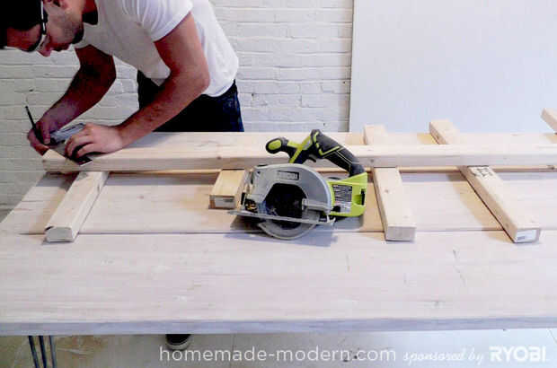 Si tienes un 7-1/4" de diámetro o mayor Sierra, ajuste la cuchilla para cortar en un ángulo de 42 grados y cortar los bloques.