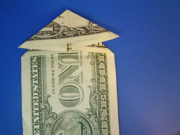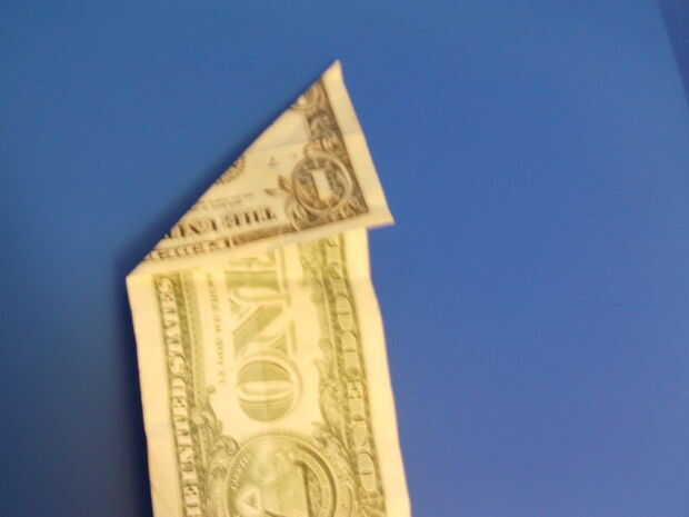-doblar la solapa de encima para que cada lado tiene una aleta (cuadros 8 y 9)