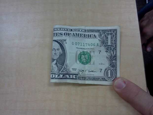 Doblar el billete de un dólar en medio, estilo hamburguesa, asegurándose de que la mitad de la muestra de cara a lo largo de la parte exterior del doblez.