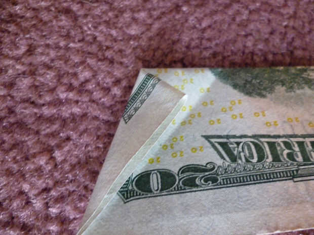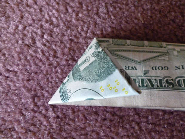 Doble la mitad superior del dinero hacia usted para cumplir con el borde inferior. A continuación, doble la esquina derecha hacia abajo como se muestra y revela. Doblar el borde extremo derecho para que sienta contra el pliegue. Ahora doblar el borde angular, nueva forma que quede paralelo al borde superior. Usted debe tener una doblada en triángulo. Doblar el borde extremo derecho para que se sienta paralelo al borde inferior, para que se vea como un versión de una que acabo de hacer al revés. Repita esto hasta que te quedas sin espacio para seguir adelante.