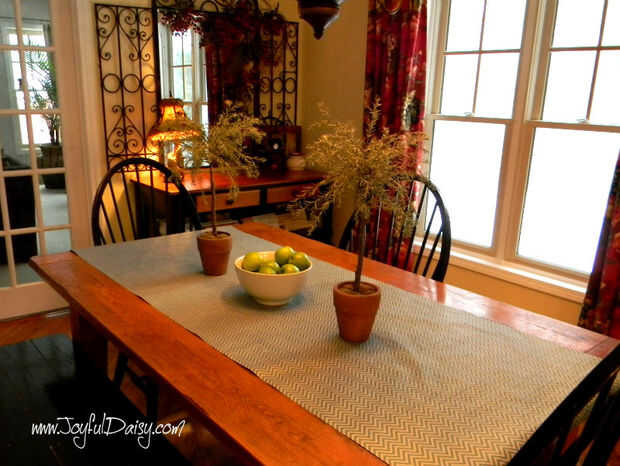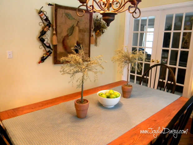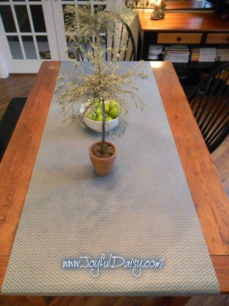 Comprar estos dos adorables rollos de papel en la tienda de dólar de $1. Un rollo fue la longitud perfecta para usar como un corredor por la mitad de mi mesa de seis pies...