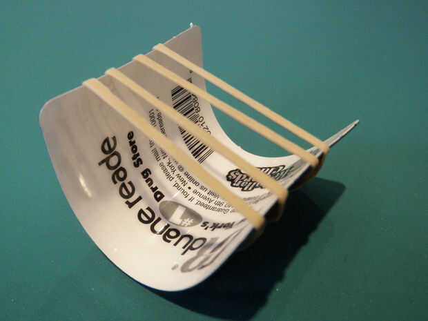 Cómo hacer un arpa miniatura de un plástico de lanzar disco o "disco frizbee". El instrumento utiliza un disco de solo 10 pulgadas de diámetro y 2 pulgadas de espesor incluyendo la cámara del resonador. Las cadenas son polímero elástico para dos