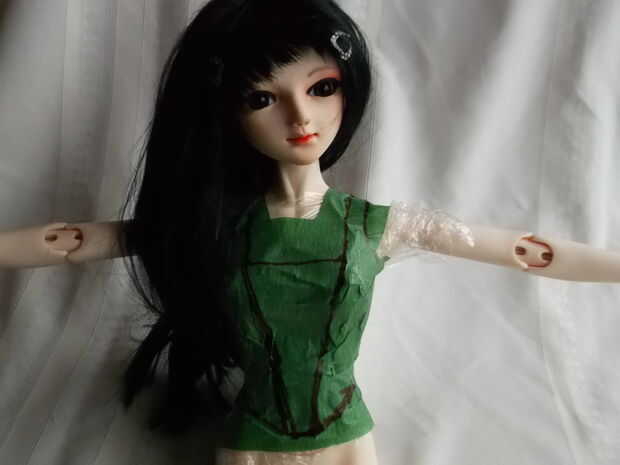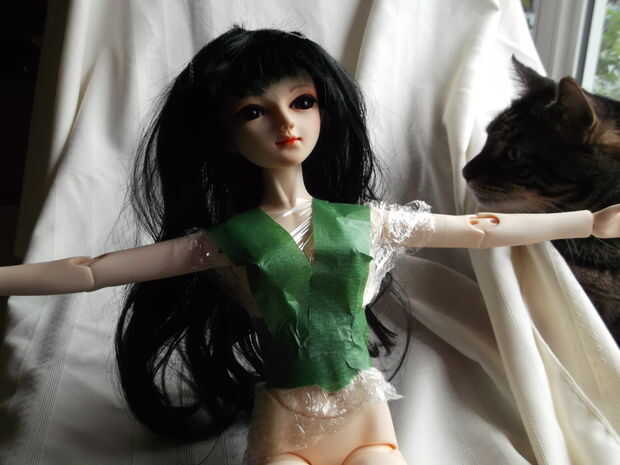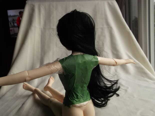 1. cubierta la parte superior del cuerpo de la muñeca en celofán para protegerla de conseguir notas adhesivas cinta todo ella.