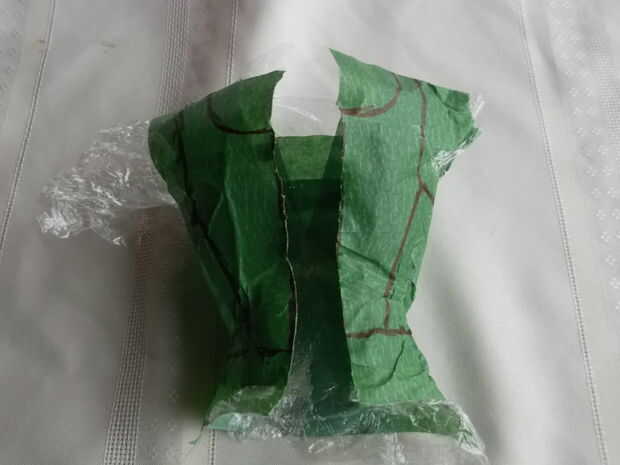 2. Haga que un "chaleco" de cinta grabando para el celofán. Trate de hacerlo en la clase de un patrón ordenado y regular. No es realmente vital para hacerlo perfectamente, pero ayuda a conseguir sus costuras alineados si es simétrico, y no quieres que sea super bultos ni nada.