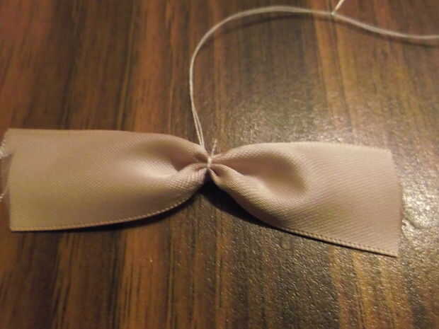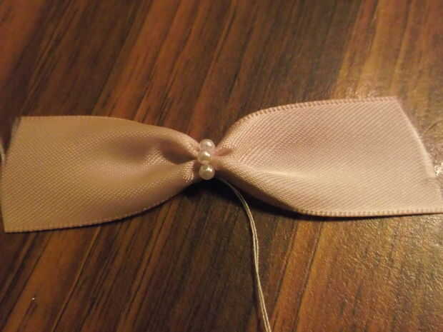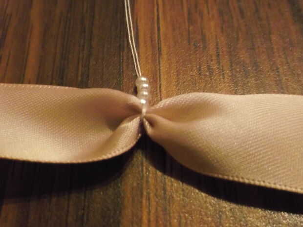 2. pase algunas perlas falsas en la rosca y Envuélvala alrededor de la parte delantera de los se reúnen, luego asegure esta cosiendo a través de la cinta.