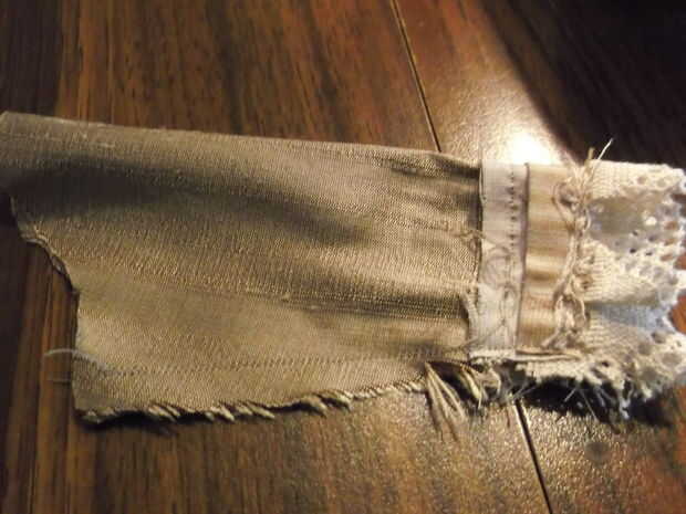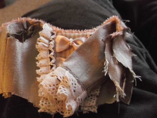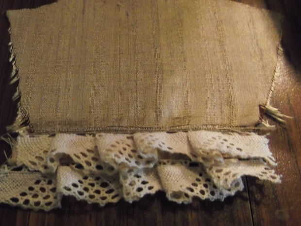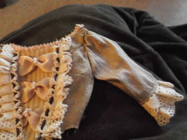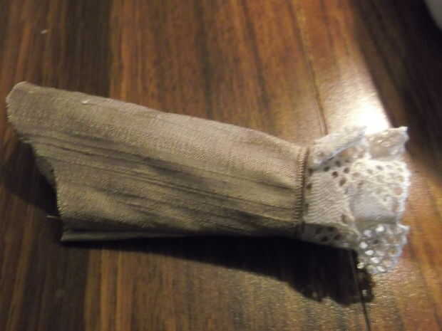 2. coser en cualquier cordón o la tela contrastante para el brazalete (hice 2 capas de encaje con un poco de tela contrastante entre) antes de coser la manga juntos en un tubo. Esto es especialmente importante cuando se trabaja en la ropa de la muñeca, a menos que no te importa tus adornos de costura a mano porque es demasiado pequeño para pasar por la máquina de coser: P