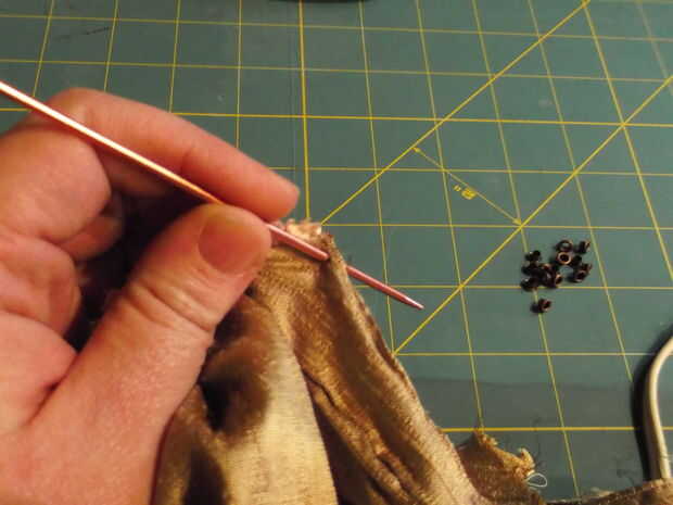 3. Coloque la herramienta de ajuste sobre el ojete, ponerlo sobre una superficie dura que no le importa marcar (no hacerlo en la mesa: P) y la herramienta unos golpes ligeros con el martillo. Básicamente, siga las instrucciones en el paquete de ojales.