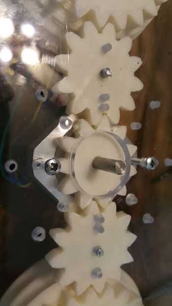 Ahora tome un motor montaje poner el gear_one y montaje que a su cama, entonces tome su middle_gear y ésos al lado del motor y luego juntar su large_gear y large_twist y poner los siguiente en línea.