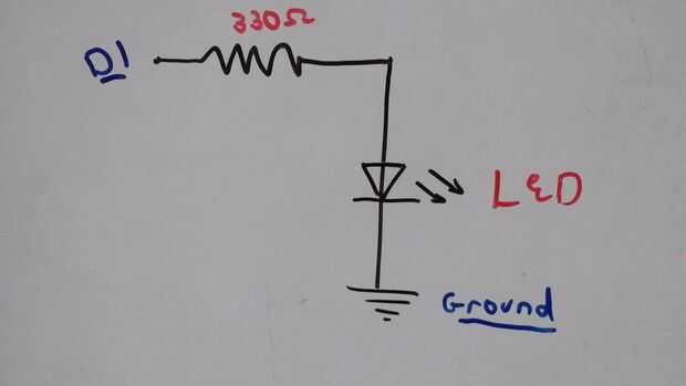 El led requiere menos 10mA entonces y tiene una caída de tensión de aproximadamente 1,8 a través de él. Los pines de Arduino funcionan a 5 voltios. Necesitamos este voltaje adicional (5-1.8 = 3.2v) caer en algún lugar o de lo contrario, la resistencia será muy baja entre los 5v y tierra, el Arduino se verá obligado a suministrar una corriente superior y puede manejar. Por lo tanto, después de los cálculos el valor de la resistencia viene a ser de 150 ohmios. Debe conectar una resistencia de 330 Ohm para estar en el lado más seguro.