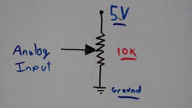 Este potencial es leído por un pin analógico en el Arduino. El Arduino asigna un valor de 0-1023. Cuando el pin analógico Lee 5v el valor 1023 y cuando el pin 0v valor es 0.