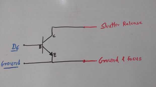 Cuando la base recibe 5v del pin 6 en el arduino que el transistor actúa como un interruptor cerrado entre el emisor y la base es decir el cable de liberación del obturador está conectado al cable de tierra y enfoque. Por lo tanto, la cámara se activa como se explica en el paso anterior.
