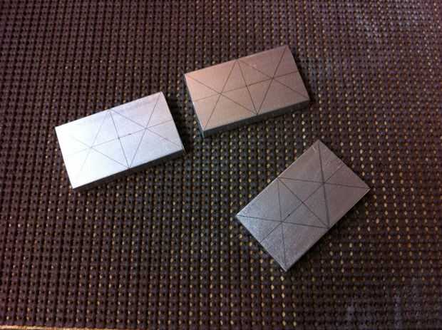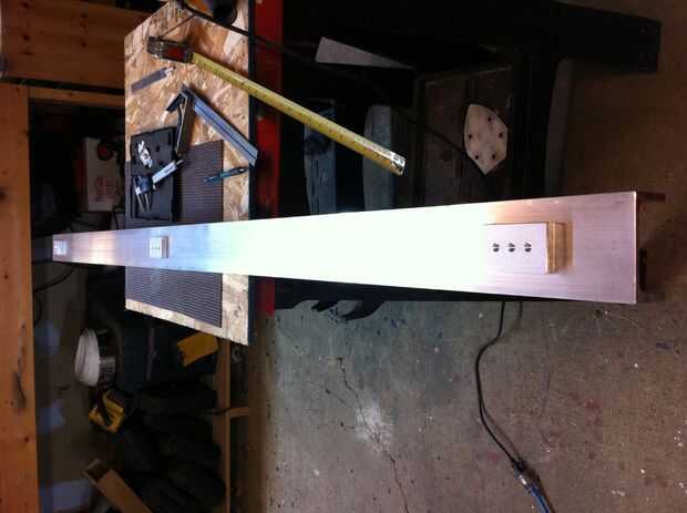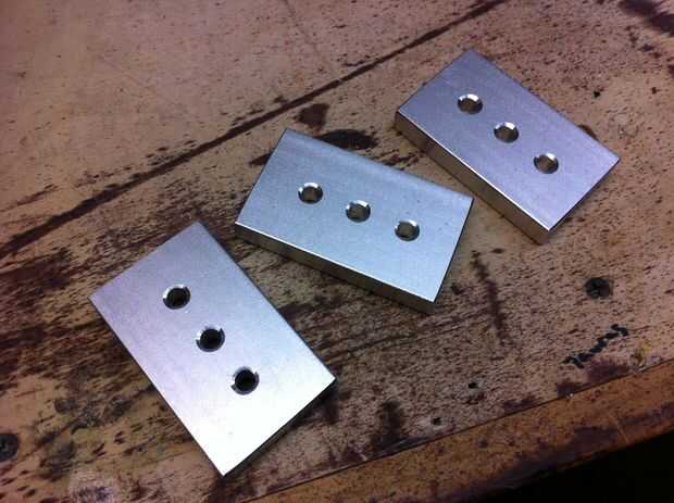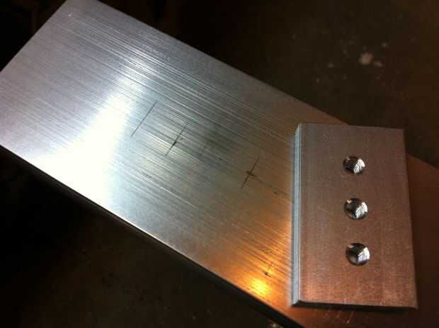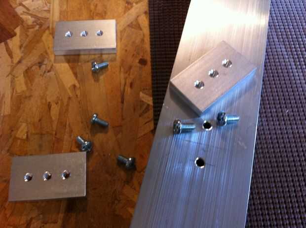 Las canalizaciones verticales son necesarios para que la plataforma no golpee la cabeza del trípode abajo. He usado 1.5" x. 5" de la barra plana de aluminio 2.5" de largo. Marqué el centro de la bodega de trípode y los otros dos agujeros para el montaje en el riel. Taladro y aprovechar los agujeros con * bit y 20 1/4 tap