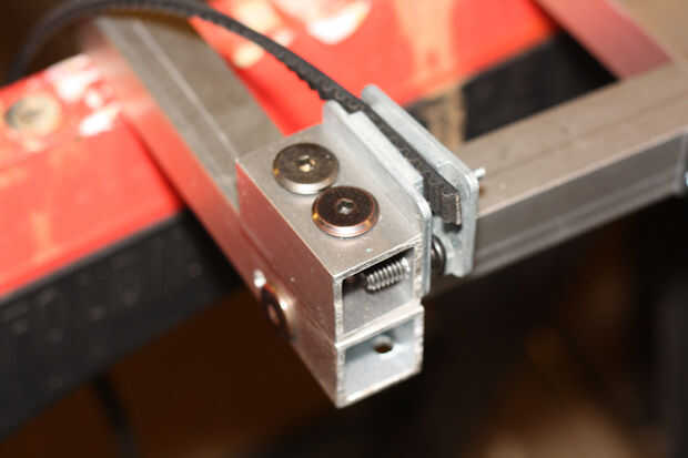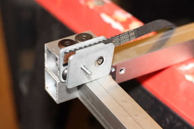 Como se puede ver en las fotos usé los trozos de aluminio para sujetar la abrazadera al carril. El truco aquí es asegurarse que el cinturón está nivelado con la polea en su carro, que sobre todo determinará cómo montar la abrazadera, justo como lo hizo mina.