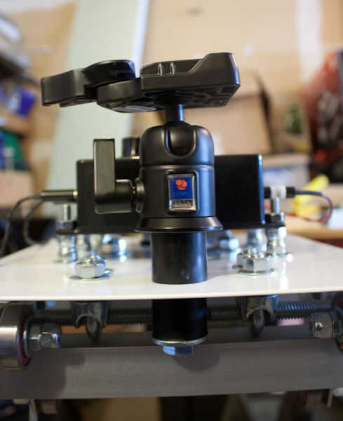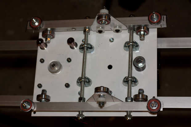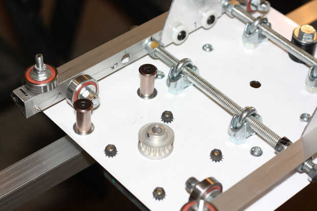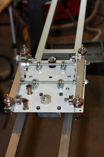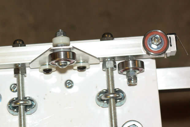 Montar los otros dos rodamientos en algún tipo de material, he usado algunas que tenía la placa de aluminio. Perfore unos agujeros en el ángulo de montaje de los estabilizadores. Coloque el marco sobre los rieles, asegúrese de que el los rodamientos están ajustados a la parte inferior de los rieles y apriete los tornillos para sostenerlos en lugar. Ahora el marco está bloqueado en los rieles. Deslice de uno de los extremos o contraer los rieles para quitarla.