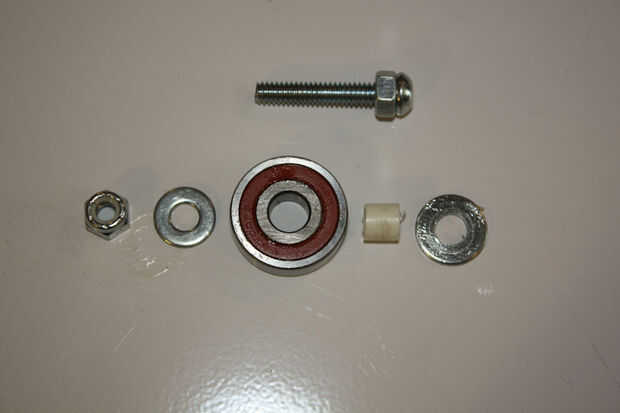 Hay una foto de abajo muestra el ensamble del rodamiento. la tuerca en el perno se utiliza como separador. La pieza de plástico es una parte de la 1/4 pluming, deberemos perforarlo con una broca de 1/4, por lo menos lo hice de todos modos.