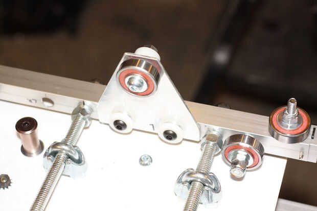 Así que en el perno va arandela espaciador de plástico, rodamiento, arandela, tuerca de seguridad. Ahora esto querrá jugar con a afinar la ubicación del rodamiento en los rieles agregar arandelas o tuercas como separadores según sea necesario, recuerden que los rodamientos que van por fuera de los carriles tienen un seguimiento sobre el reborde de las tuercas de barril.