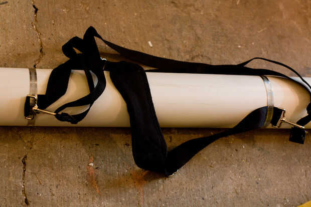 Para las bandas usé algunas correas para los hombros de algunos bolsos viejos de la cámara y utiliza 4" abrazaderas para sujetar las correas. Encontrar el centro de equilibrio y desde allí, asegurándose de que las correas sean lo suficientemente largos para usar como una mochila, dejé una correa un poco más larga que el otro, este inclina el tubo en un poco de un ángulo por lo que no está arrastrando por el suelo.