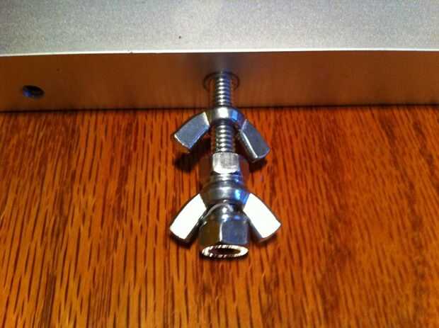 Ahora el perno. Corte 2 3" piezas de 1/4 20 varilla roscada. Lo que hice fue emparedado de una tuerca de mariposa entre dos tuercas para "bloquear" la tuerca de mariposa en lugar de actuar como un mango. lo que hago es que doy al cerrojo un par de vueltas en la parte inferior del riel, luego apriete la tuerca de ala segunda para un lazo muy apretado.