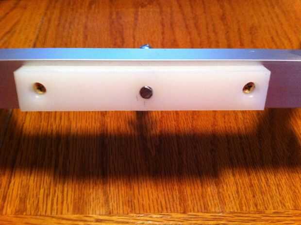 Taladre dos agujeros alrededor y 1 1/2" en cada borde con una broca de taladro #2 y rosca con la broca de 1/4 20, donde las patas. Luego marque el centro de la parte superior del tubo cuadrado y el taladro de 1/4" agujero directamente a través de. Añadí un pedazo de 3/8 de HMWP (polietileno de alto peso molecular, placas de hockey) como un separador por dos razones. 1 que necesitaba para levantar la pista un poco para que la parte superior de las piernas sería despejar los carriles. 2. el HMWP mantiene el perno caigan cuando no sujeta a los rieles. Simplemente perforar un agujero de 1/4" en el centro de 4" x 3/4 "tira y taladro y contador hundido dos agujeros para los tornillos acoplar a la tubería.
