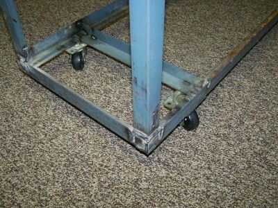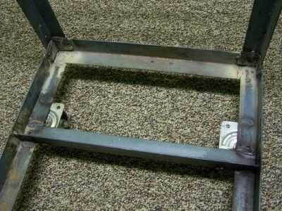 he añadido un travesaño adicional en la parte delantera de las ruedas. También puede ver las verticales para el mango. La cruceta sirve también para mantener las primeras sillas cargadas de deslizamiento hacia adelante en el marco del carro. La segunda foto muestra la parte trasera de la carretilla desde otra perspectiva. No utilizó ningún refuerzo para las verticales, pero soldados de donde pude para garantizar las verticales con más de una soldadura. Observe las ruedas giratorias. Tener en la parte trasera facilita dirigir el carro cuando está cargado.