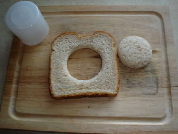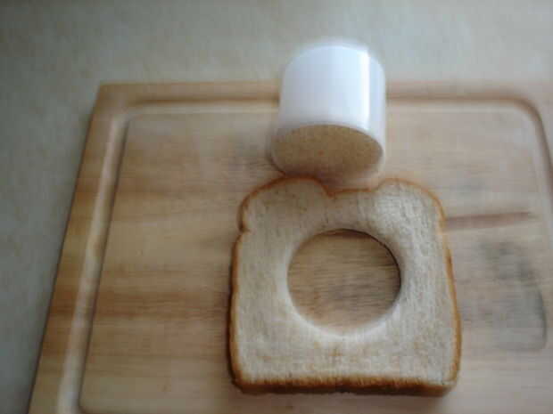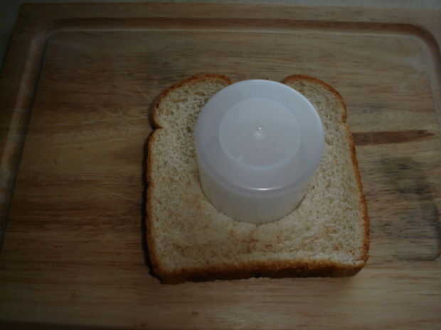 Coloque una rebanada de pan sobre una tabla para cortar madera. Lugar el plástico de la tapa de aerosol de aceite de cocina puede en el centro del pan, con la abertura hacia el pan. Suavemente pero firmemente Presione hacia abajo en la parte superior de la tapa de plástico del aerosol de aceite de cocina puede y gírelo hacia atrás y hacia adelante para cortar limpiamente el centro del pan. Esto comprime los bordes del círculo cortado y forma un sello mejor el huevo caiga en.