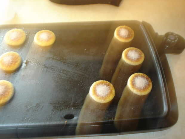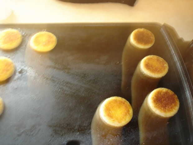 Una vez que han sido plateadas todas las rebanadas de pan, capa de la superficie de la plancha (o sartén) ligeramente con el aceite de cocina del aerosol. Cubrir la parte inferior de los círculos de pan con el aceite de cocina del aerosol y póngalos en la plancha (o sartén) (dos por ración). Cubrir la parte superior de los círculos de pan con el aceite de cocina del aerosol. Levantar para comprobar si está hecho después de dos minutos, (si se ven