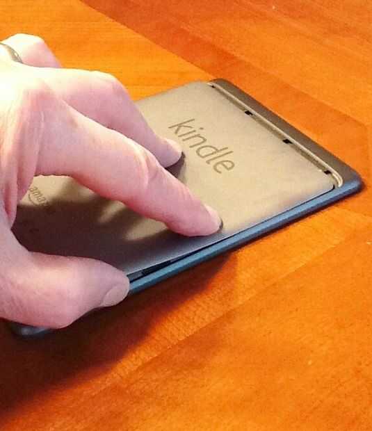 La mitad superior de la espalda no desabrochar, pero resbala de la Kindle. Mientras se mantiene la unsnapped parte inferior hacia arriba, deslice la parte posterior de la parte superior de la Kindle. Sería hacia el lado izquierdo de la foto.