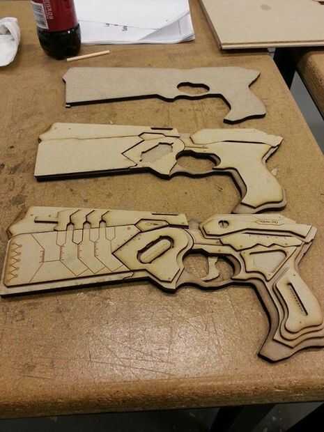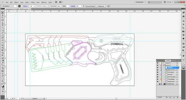 Primer paso fue crear una imagen de virales para el cortador del laser. Cada mitad del apoyo fue hecho de 4 capas de 1/8" MDF, con cada capa que es la capa específica propia en Illustrator. Escala se logró establecer el tamaño del grip del tamaño de una de mis armas de airsoft, es decir, echando un vistazo lo.