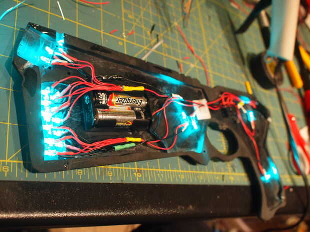 Entonces está instalando el material de 3mm LED. Acabé de corte poco soportes para los LEDs fijar en y pegado en una mitad del molde. Todo esto es alimentado por dos baterías de AA y se un simple interruptor ON/OFF colocado en la parte posterior de la empuñadura.