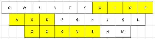 para la fila casera necesitarás memorizar A, S, D (su muy fácil de memorizar especialmente si eres un gamer ^. ^). letra E y yo hemos sido mención en la primera fila la segunda fila se iniciará con la letra F y por orden alfabético hasta la letra L. Luego se seguirá con el lado derecho de la tercera fila con M y N.