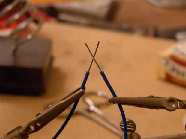 Ahora que los cables se pelan con básicamente la misma longitud. hay que cruzar en forma de X, Dónde está el centro de la x sobre el punto medio de las 2 secciones peladas de alambre