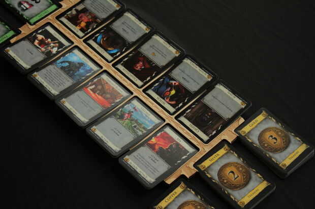 He diseñado un sencillo, laser-cut "carrito" que mantiene la mayoría de las cubiertas organizados en un arreglo estéticamente agradable, da las cubiertas de acción un ángulo ligero para facilitar el sacar de y es obvio cuando una cubierta se ha agotado (una de las condiciones de final de la partida).