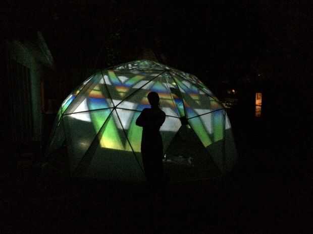 Se trata de un sistema de proyección de la impresionante cúpula que construimos para un festival de arte camping. Un proyector solo puede brillar una imagen a través de la bóveda entera por despedir apagado de un espejo esférico. La superficie de la cúpula es translúcida, por lo que las imágenes se pueden ver desde dentro o fuera.
